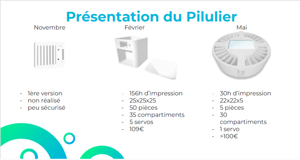 Versions suivantes : Modèles plus aboutis avec un design optimisé, intégration de servomoteurs pour la distribution précise des médicaments, et une interface utilisateur conviviale.