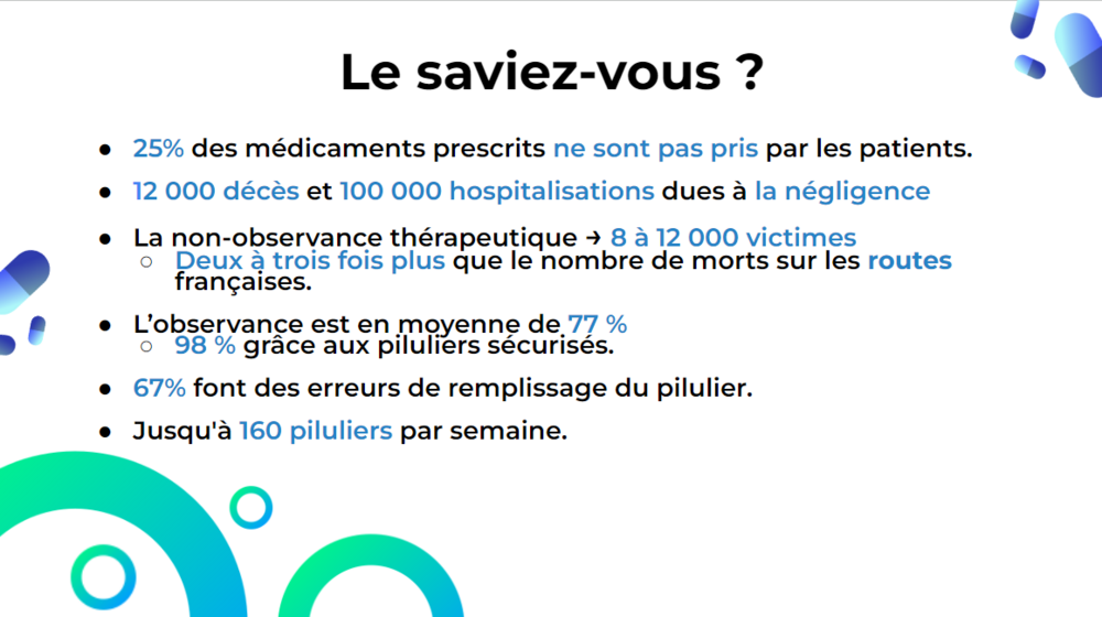 Les statistiques sont alarmantes : 25% des médicaments prescrits ne sont pas pris par les patients, entraînant des milliers de décès et d’hospitalisations chaque année. Le pilulier intelligent MedicSense conçu par les étudiants vise à réduire ces chiffres en automatisant la gestion des médicaments et en envoyant des notifications aux utilisateurs et à leurs proches.