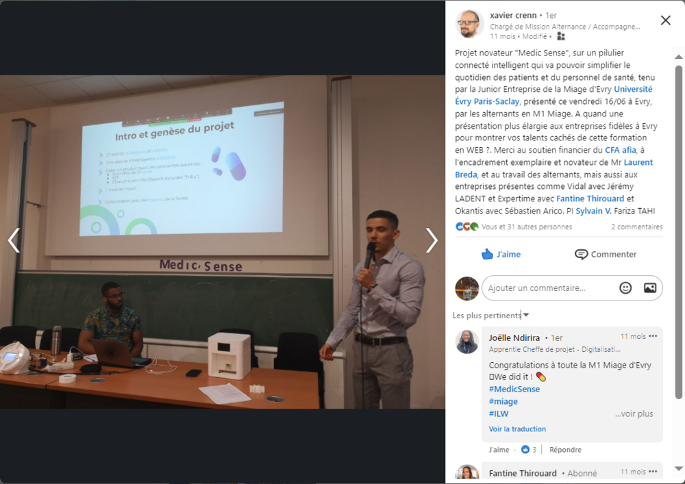 Le pilulier intelligent MedicSense, développé par les étudiants de M1 MIAGE Apprentissage 2022/2023, est une solution innovante qui répond à des besoins cruciaux dans le domaine de la santé. Grâce à leur détermination, leur créativité et leur rigueur, ces étudiants ont montré comment la technologie peut améliorer la qualité de vie des patients et ouvrir de nouvelles perspectives dans le secteur médical. Leur projet incarne parfaitement la synergie entre l’éducation universitaire et les besoins réels du marché.